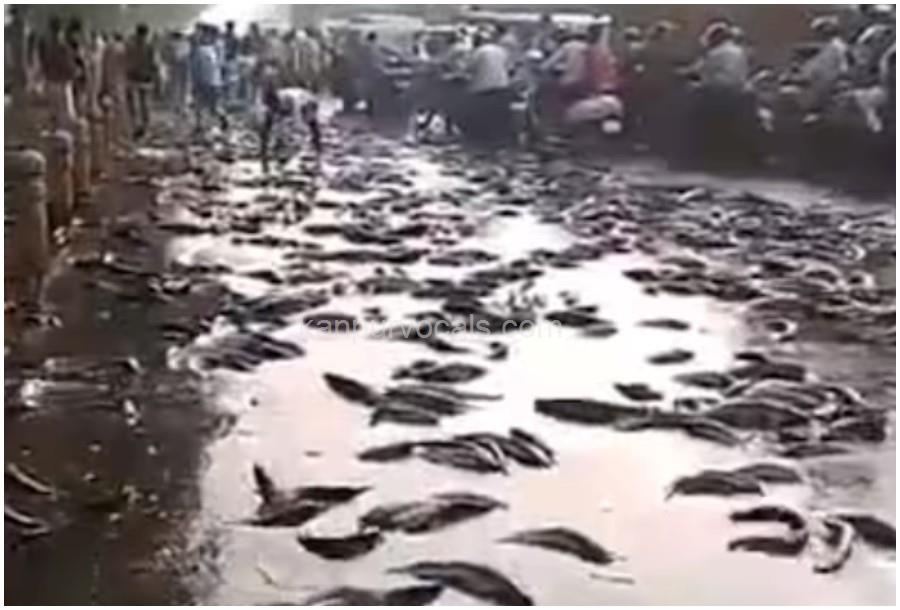 कानपुर न्यूज डेस्क: कानपुर के चौबेपुर थाना क्षेत्र के मरियानी गांव के पास बुधवार सुबह एक अजीबोगरीब हादसा हुआ। मछलियों से भरी एक टाटा पिकअप अनियंत्रित होकर सड़क पर पलट गई। हादसा इतना अचानक हुआ कि देखते ही देखते सैकड़ों मछलियां हाईवे पर बिखर गईं और पूरा रास्ता मछलियों से पट गया।